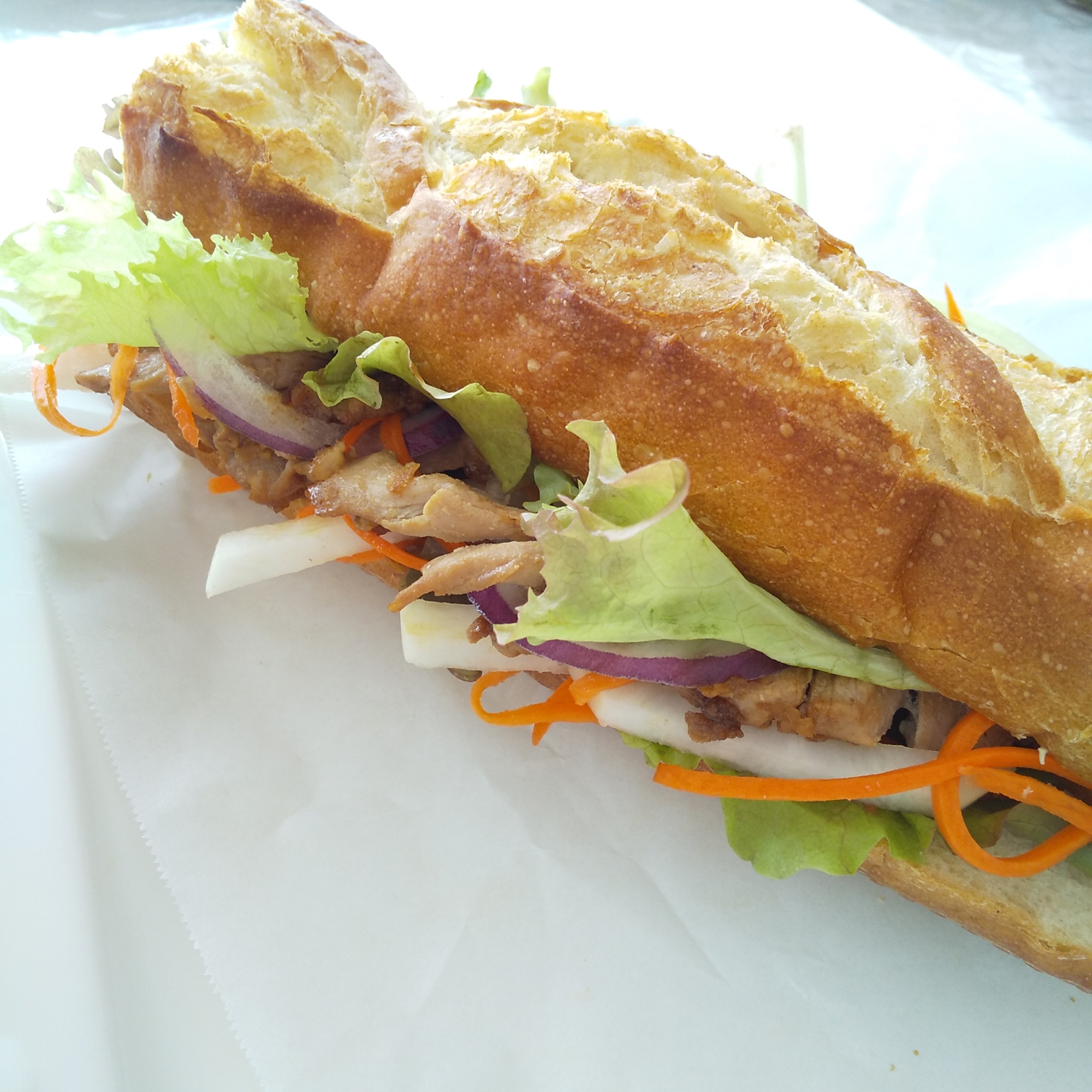 豚肉の薄切りをマヨネーズと醤油、オイスターソースで炒めます。大根&人参の甘酢漬けと合わせてフランスパンでサンドします。野菜沢山で栄養たっぷりなバインミーサンド!