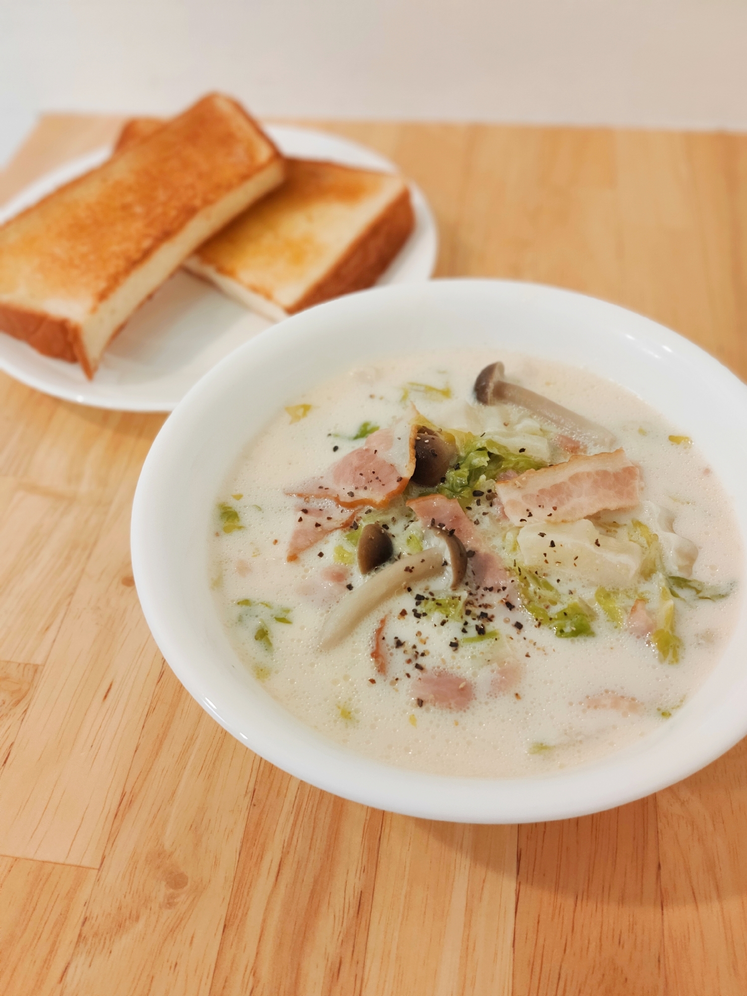 白菜たっぷりのコンソメスープに牛乳を足して、優しい味のミルクスープを作りました。ベーコンとバターを入れてコクをUP✨パンにも合うので朝食にぴったりです♬︎