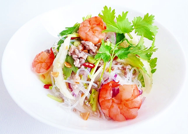 タイで親しまれている春雨のサラダです。 唐辛子をアクセントに香り高い野菜をナンプラーとレモンで爽やかに味付けした、暑い夏やお酒の一品にお勧めの大人なサラダです。